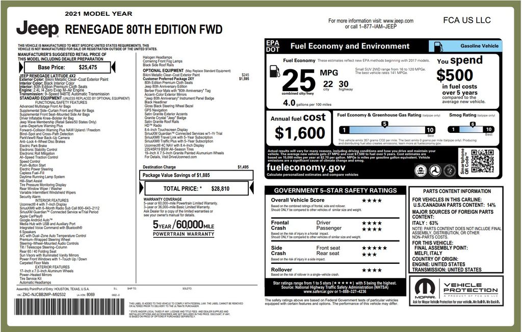 - Interior: 80th Edition Premium Cloth Seats, Jeep 80th Anniversary Edition, Berber Floor Mats with "80th Anniversary" Tag, Accent Color Exterior Mirrors, "Jeep 80th Anniversary" Instrument Panel Badge, Black Headliner, Gloss Black Steering Wheel Bezel, GPS Navigation, A/C with Dual Zone Auto Temperature Control, Premium Wrapped Steering Wheel, Steering Wheel Mounted Audio Controls, Tilt / Telescope Steering Column, Rear 60 / 40 Folding Seat, Sun Visors with Illuminated Vanity Mirrors, Power Front Windows with 1Touch Up / Down and a Carpeted Floor Mats