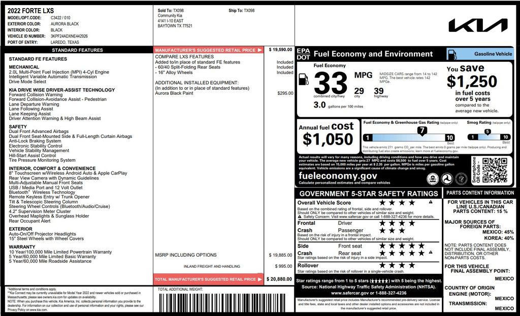 2022 Kia Forte LXS features a 2.0L Multi-Point Fuel Injection (MPI) 4-Cyl Engine!