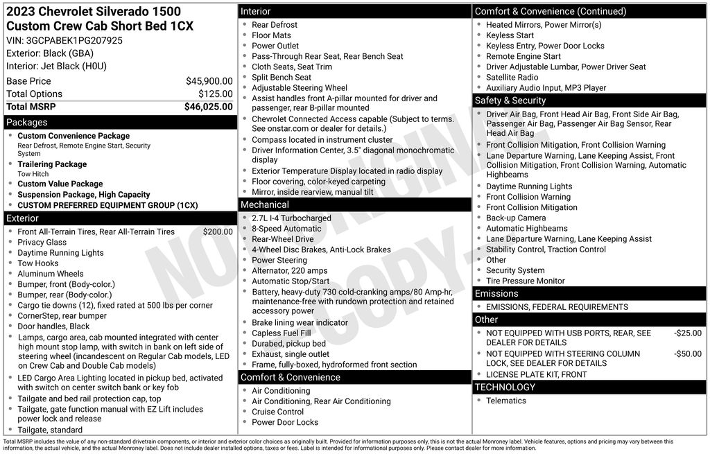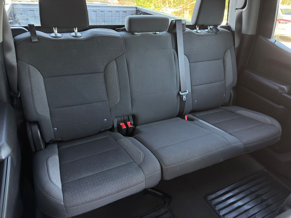 Apple CarPlay/Android Auto, Auto High-beam Headlights, Automatic Emergency Braking, Bluetooth® For Phone, Brake assist, Bumpers: body-color, Chevrolet Connected Access Capable, Cloth Seat Trim, Color-Keyed Carpeting Floor Covering, Compass, Custom Convenience Package, Custom Value Package, Deep-Tinted Glass, Delay-off headlights, Driver door bin, Driver vanity mirror, Dual front impact airbags, Dual front side impact airbags, Dual Rear USB Ports (Charge Only), Electric Rear-Window Defogger, Electrical Steering Column Lock, Electronic Cruise Control, Electronic Stability Control, EZ Lift Power Lock & Release Tailgate, Following Distance Indicator, Forward Collision Alert, Front anti-roll bar, Front Center Armrest w/Storage, Front Frame-Mounted Black Recovery Hooks, Front License Plate Kit, Front Pedestrian Braking, Front reading lights, Front Rubberized Vinyl Floor Mats, Front wheel independent suspension, Fully automatic headlights, HD Rear Vision Camera, Heated door mirrors, High Capacity Suspension Package, Hitch Guidance, Illuminated entry, IntelliBeam Automatic High Beam On/Off, Lane Keep Assist w/Lane Departure Warning, LED Cargo Area Lighting, Low tire pressure warning, Manual Tilt Wheel Steering Column, Not Equipped w/Rear USB Ports, Not Equipped w/Steering Column Lock, Occupant sensing airbag, OnStar & Chevrolet Connected Services Capable, Outside temperature display, Overhead airbag, Overhead console, Panic alarm, Passenger door bin, Passenger vanity mirror, Power door mirrors, Power driver seat, Power Front Windows w/Driver Express Up/Down, Power Front Windows w/Passenger Express Down, Power Rear Windows w/Express Down, Power steering, Power windows, Preferred Equipment Group 1CX, Premium audio system: Chevrolet Infotainment 3, Radio data system, Radio: Chevrolet Infotainment 3 System, Rear 60/40 Folding Bench Seat (Folds Up), Rear reading lights, Rear Rubberized-Vinyl Floor Mats, Rear step bumper, Rear window defroster, Remote Keyless Entry, Remote keyless entry, Remote Vehicle Starter System, Security system, SiriusXM Radio, Speed control, Speed-sensing steering, Split folding rear seat, Standard Tailgate, Tachometer, Theft Deterrent System (Unauthorized Entry), Tilt steering wheel, Traction control, Trailering Package, Trip computer, Variably intermittent wipers, Voltmeter, Wheels: 20" x 9" Bright Silver Painted Aluminum, Wi-Fi Hot Spot Capable, Wireless Phone Projection, **CLEAN AUTOCHECK**, **BACKUP CAMERA**, APPLE CARPLAY, 8-Speed Automatic, Black Cloth.