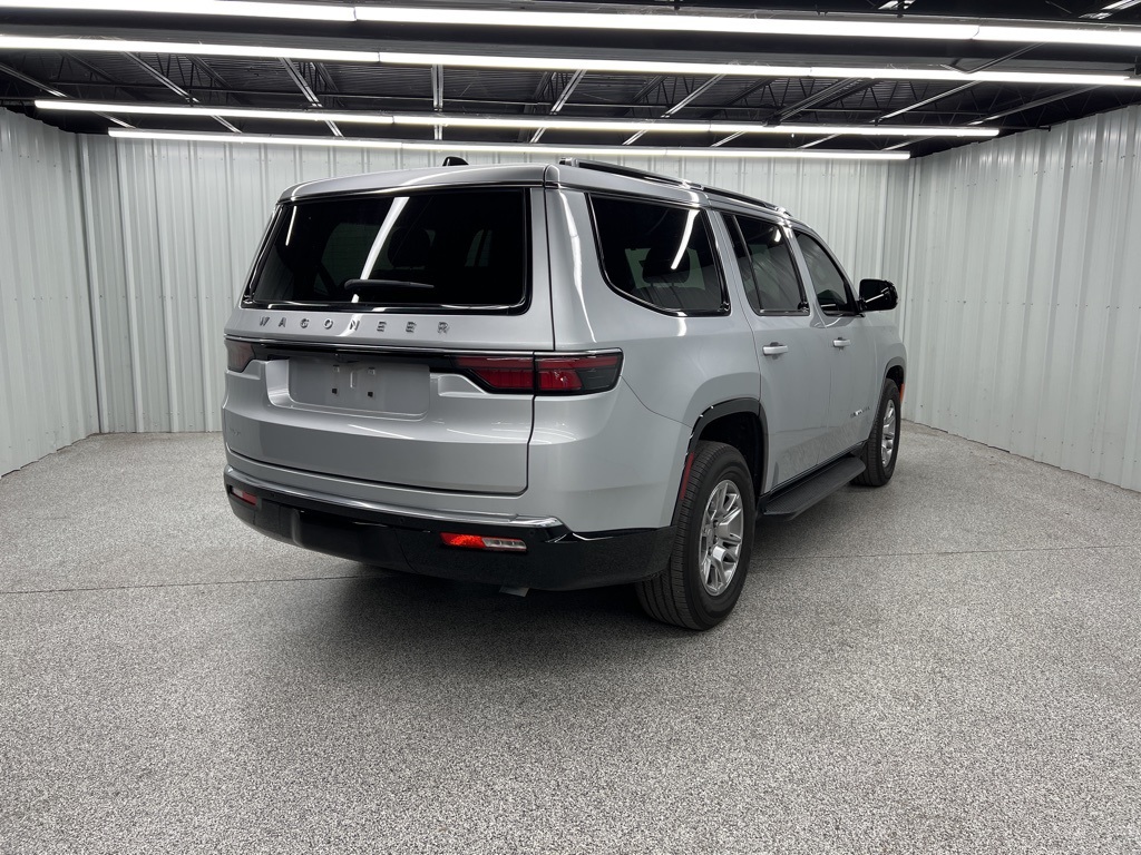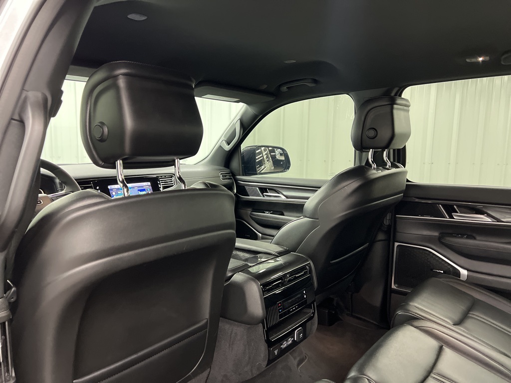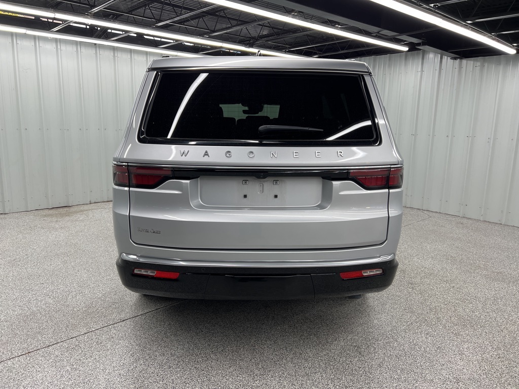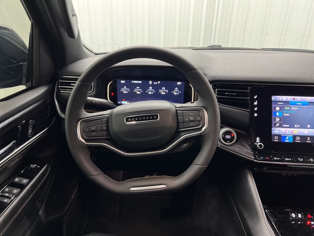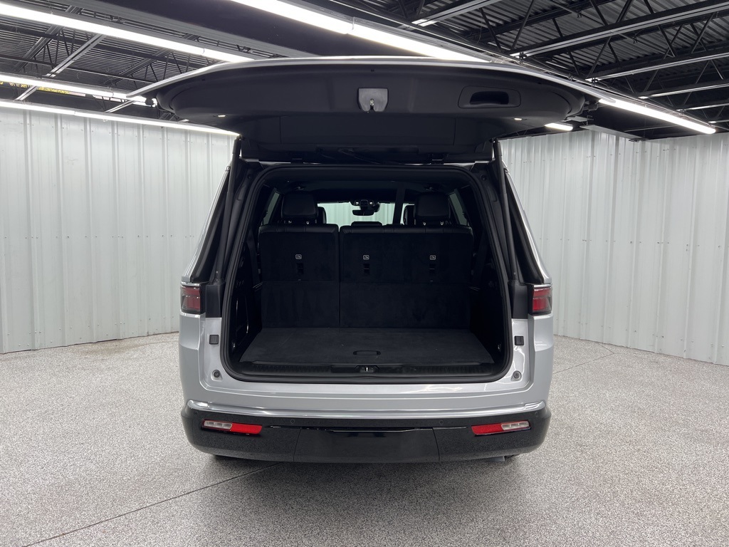 temperature control, Brake assist, Bumpers: body-color, Compass, Delay-off headlights, Driver door bin, Driver vanity mirror, Driver's Seat Mounted Armrest, Dual front impact airbags, Dual front side impact airbags, Electronic Stability Control, Emergency communication system: Wagoneer Connect, Exterior Parking Camera Rear, Four wheel independent suspension, Front anti-roll bar, Front Bucket Seats, Front Center Armrest w/Storage, Front dual zone A/C, Front fog lights, Front reading lights, Fully automatic headlights, Garage door transmitter, Heated door mirrors, Heated front seats, Heated steering wheel, Illuminated entry, Knee airbag, Leather Trimmed Bucket Seats, Low tire pressure warning, Memory seat, Navigation System, Normal Duty Suspension, Occupant sensing airbag, Outside temperature display, Overhead airbag, Overhead console, Panic alarm, Passenger door bin, Passenger seat mounted armrest, Passenger vanity mirror, Pedal memory, Power adjustable front head restraints, Power door mirrors, Power driver seat, Power Liftgate, Power passenger seat, Power steering, Power windows, Radio data system, Radio: Uconnect 5 Nav w/10.1" Display, Rear air conditioning, Rear anti-roll bar, Rear dual zone A/C, Rear reading lights, Rear seat center armrest, Rear window defroster, Rear window wiper, Reclining 3rd row seat, Remote keyless entry, Security system, Speed control, Speed-sensing steering, Speed-Sensitive Wipers, Split folding rear seat, Steering wheel memory, Steering wheel mounted audio controls, Tachometer, Telescoping steering wheel, Tilt steering wheel, Traction control, Trip computer, Turn signal indicator mirrors, Variably intermittent wipers, Ventilated front seats, Voltmeter, and Wheels: 18" x 8.0" Aluminum Base Finish.