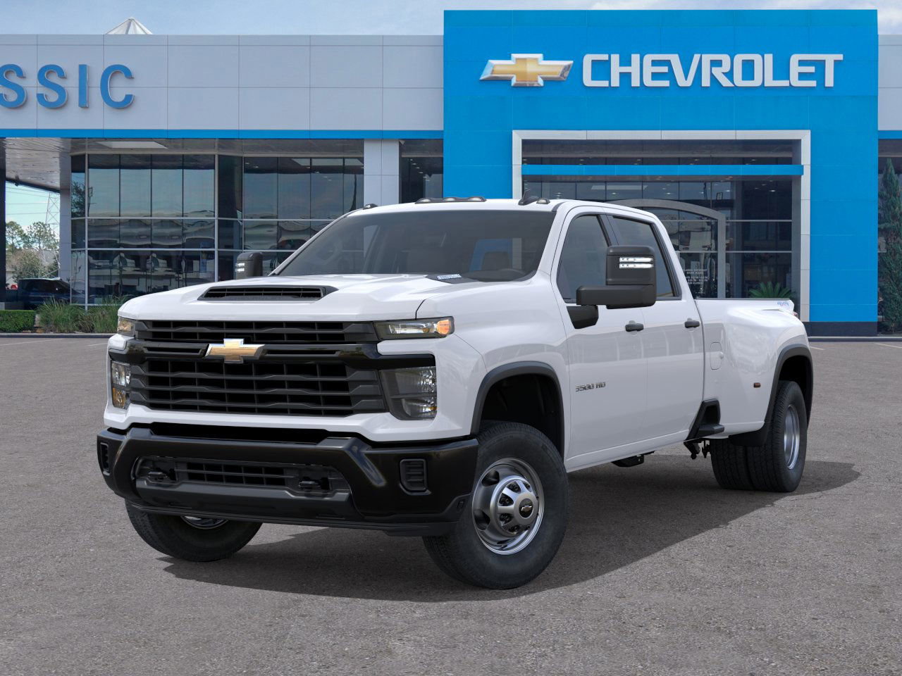 led hitch package - Wheels and tires: 17-inch painted steel wheels; front and rear all-terrain tires Powertrain and performance - Engine: Duramax 6.6L Turbo-Diesel V8 with B20 compatibility - Output: 470 hp, 975 lb-ft of torque for serious hauling and towing - Transmission: 10-speed automatic for smooth shifts and effective torque delivery - Emissions coverage: 50-state compliance for nationwide use Capability and towing - GVWR: 14,000 lbs to handle heavy workloads - Gooseneck/5th Wheel Prep Package: ready for advanced towing setups - Tow hitch included; dealer-installed hitch package for quick connectivity - Rear axle: 3.42 ratio supports strong payload and stable highway performance Exterior and bed features - 17-inch painted steel wheels with all-terrain tires - Bed protection: Chevytec spray-on bedliner included - Multi-Flex tailgate provides six load/access functions for versatility Interior and convenience - Interior: Jet Black, vinyl seating suited to rugged use - Seating: Front captain/bench configuration with a pass-through rear seat - Comfort and convenience: EZ Lift power lock and release tailgate; tinted windows; rear-window defogger; power trailer mirrors with heated upper glass; manual extending/folding Technology and connectivity - Audio and entertainment: AM/FM, MP3, Bluetooth; auxiliary input - Connectivity: WiFi hotspot; Smart Device Integration - Telematics: Navigation from Telematics (subscription required) Safety and driver assistance - Forward safety: F