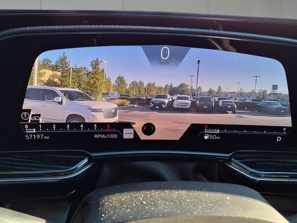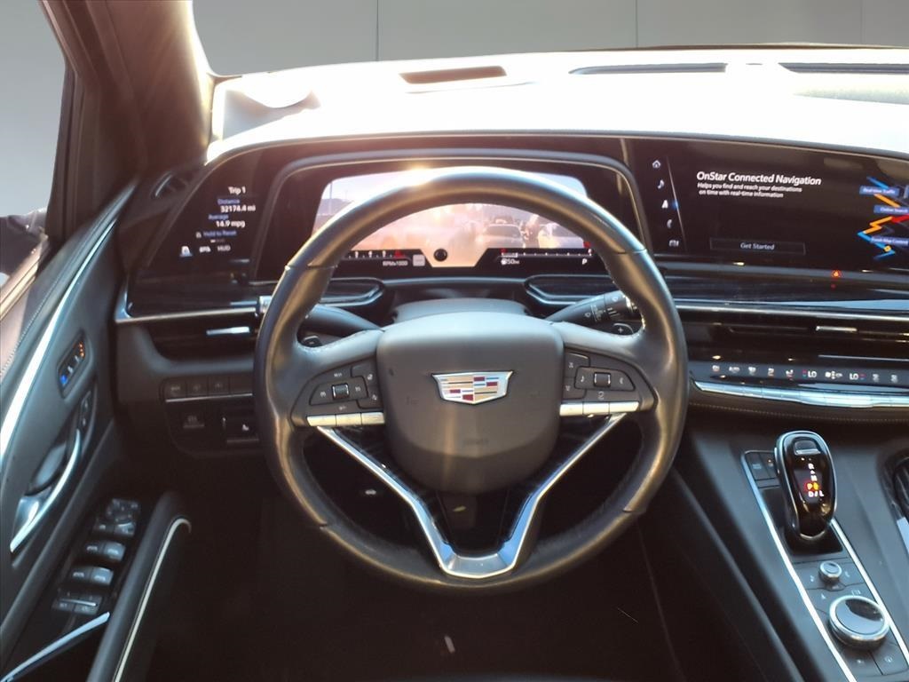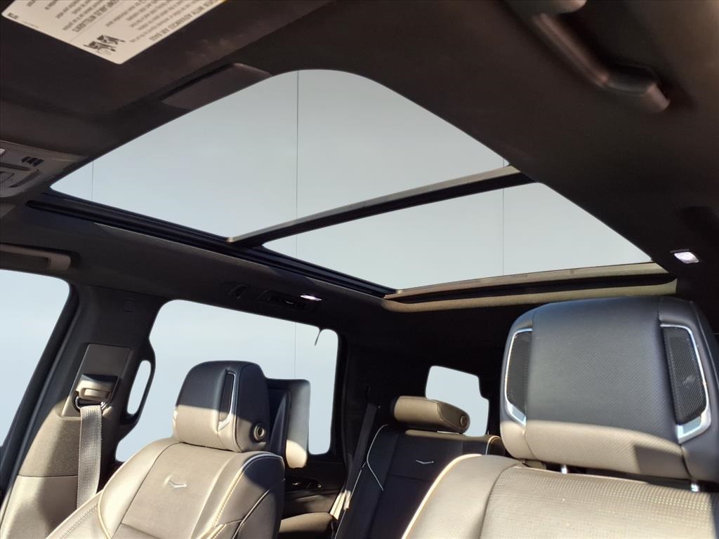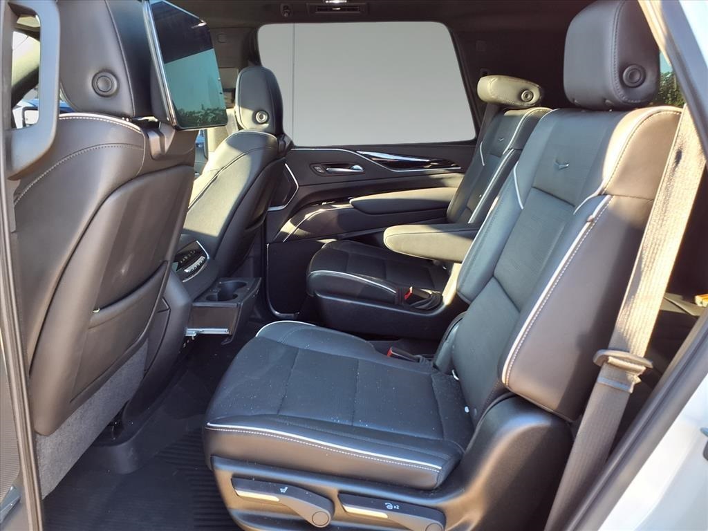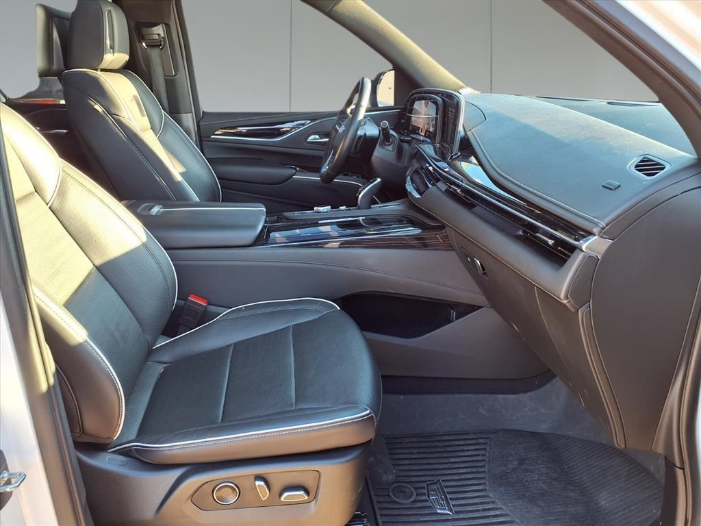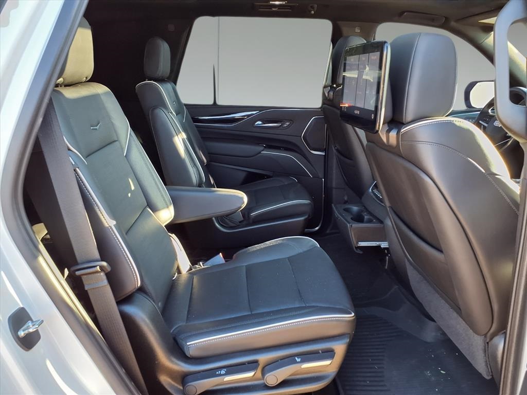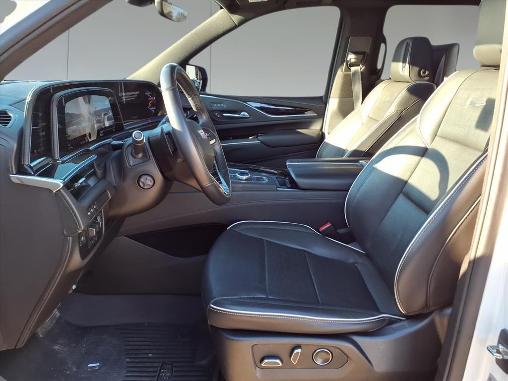 Nameplate (LPO), Monochrome Cadillac Emblems (LPO), Puddle Lamps w/Cadillac Crest (LPO), Wheels: 22" 12-Spoke Gloss Black Alloy (LPO), and Wheels: 22" Interim (LPO)), Preferred Equipment Group 1SC (Air Ionizer, AKG Studio 19-Speaker Audio System, Automatic Emergency Braking, Body-Color Door Handles, Door Lock & Latch Shields, Electronic Cruise Control w/Set & Resume Speed, Electronic Limited-Slip Differential, Enhanced Automatic Parking Assist, Glass Breakage Sensor, Hitch Guidance w/Hitch View, In-Vehicle Trailering System App, Integrated Trailer Brake Controller, Lane Keep Assist w/Lane Departure Warning, Power Panoramic Tilt-Sliding Sunroof, Rear Camera Mirror, Rear Camera Mirror Washer, Rear Cross Traffic Alert, Reconfigurable Full-Color Head-Up Display, Running Board Assist Steps, Theft-Deterrent Alarm System, Trailer Side Blind Zone Alert, Vehicle Inclination Sensor, and Vehicle Interior Movement Sensor), Cadillac Certified Pre-Owned Certified, Black Leather, 16.9" Diagonal OLED Infotainment Screen, 19 Speakers, 2-Presets Memory For Driver Seat Adjuster, 3.23 Axle Ratio, 3rd row seats: split-bench, 4-Way Power Driver Lumbar Seat Adjuster, 4-Way Power Front Passenger Lumbar Seat Adjuster, 4-Wheel Disc Brakes, 8-Way Power Driver Seat Adjuster, 8-Way Power Front Passenger Seat Adjuster, ABS brakes, Adaptive suspension, Air Conditioning, Alloy wheels, AM/FM radio: SiriusXM with 360L, Apple CarPlay/Android Auto, Audio memory, Auto High-beam Headlights, Auto tilt-away steering wheel, Auto-dimming door mirrors, Auto-dimming Rear-View mirror, Automatic temperature control, Brake assist, Bumpers: body-color, Compass, Delay-off headlights, Driver door bin, Driver vanity mirror, Dual front impact airbags, Dual front side impact airbags, Electronic Stability Control, Emergency communication system: OnStar and Cadillac connected services capable, Four wheel independent suspension, Front anti-roll bar, Front Bucket Seats, Front Center Armrest w/Storage, Front dual zone A/C, Front License Plate Bracket, Front reading lights, Fully automatic headlights, Garage door transmitter, HD Radio, Heads-Up Display, Heated & Ventilated Driver & Front Passenger Seats, Heated door mirrors, Heated Driver & Front Passenger Seats, Heated front seats, Heated rear seats, Heated steering wheel, Illuminated entry, Leather Seating Surfaces w/Precision Perf Inserts, Leather steering wheel, Low tire pressure warning, Magnetic Ride Control Suspension, Memory seat, Navigation System, Occupant sensing airbag, Outside temperature display, Overhead airbag, Overhead console, Panic alarm, Passenger door bin, Passenger vanity mirror, Power door mirrors, Power driver seat, Power Liftgate, Power moonroof, Power passenger seat, Power steering, Power windows, Power-Retractable Assist Steps, Radio data system, Radio: AM/FM/SiriusXM w/Navigation, Rain sensing wipers, Rear air conditioning, Rear anti-roll bar, Rear reading lights, Rear Seat Entertainment System, Rear window defroster, Rear window wiper, Remote keyless entry, Roof rack: rails only, Security system, SiriusXM w/360L, Speed control, Split folding rear seat, Spoiler, Steering wheel memory, Steering wheel mounted audio controls, Tachometer, Teen Driver, Telescoping steering wheel, Tilt steering wheel, Traction control, Trip computer, Turn signal indicator mirrors, Variably intermittent wipers, Ventilated front seats, Voltmeter, Wheels: 22" 12-Spoke Polished Alloy, and Wireless Apple CarPlay/Wireless Android Auto. Recent A